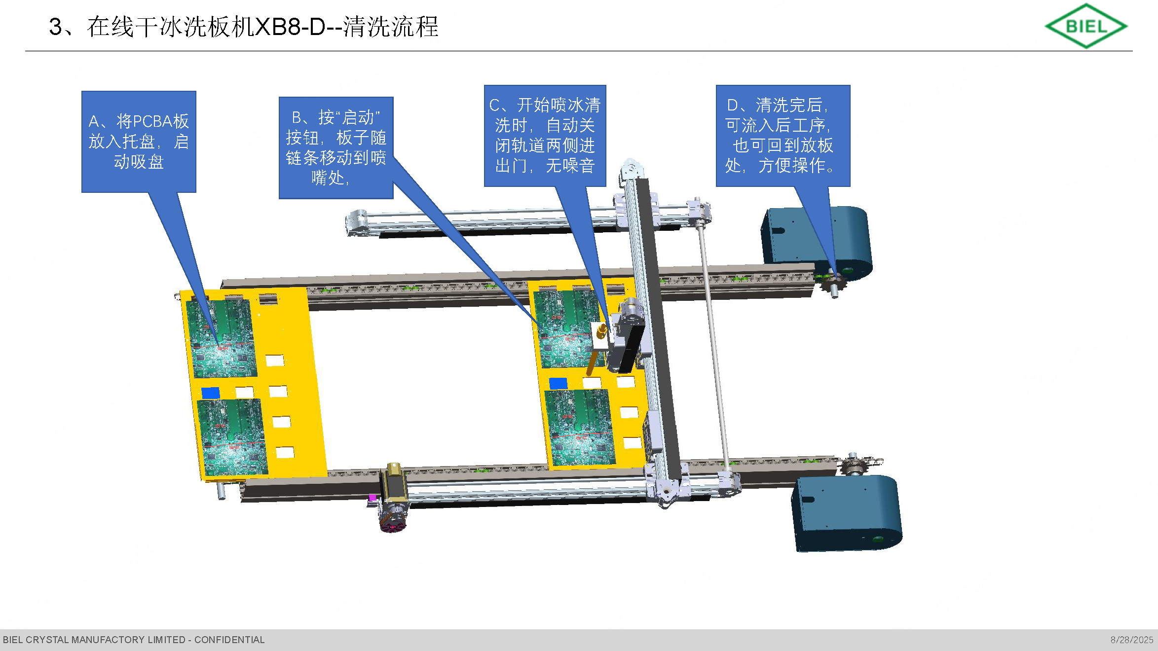 全自動干冰清洗的優勢主要能保持PCBA板被清洗的一致性,不該洗的傳感器、晶振,自動干冰清洗機絕對能不去碰他們。省去人工過于重復清洗浪費的干冰與時間。 也控制人為疏忽將電路板上的元器件打壞的行為。當板子洗完后,PCBA自動進入下一工序AOI檢測機,實現完全自動化。">